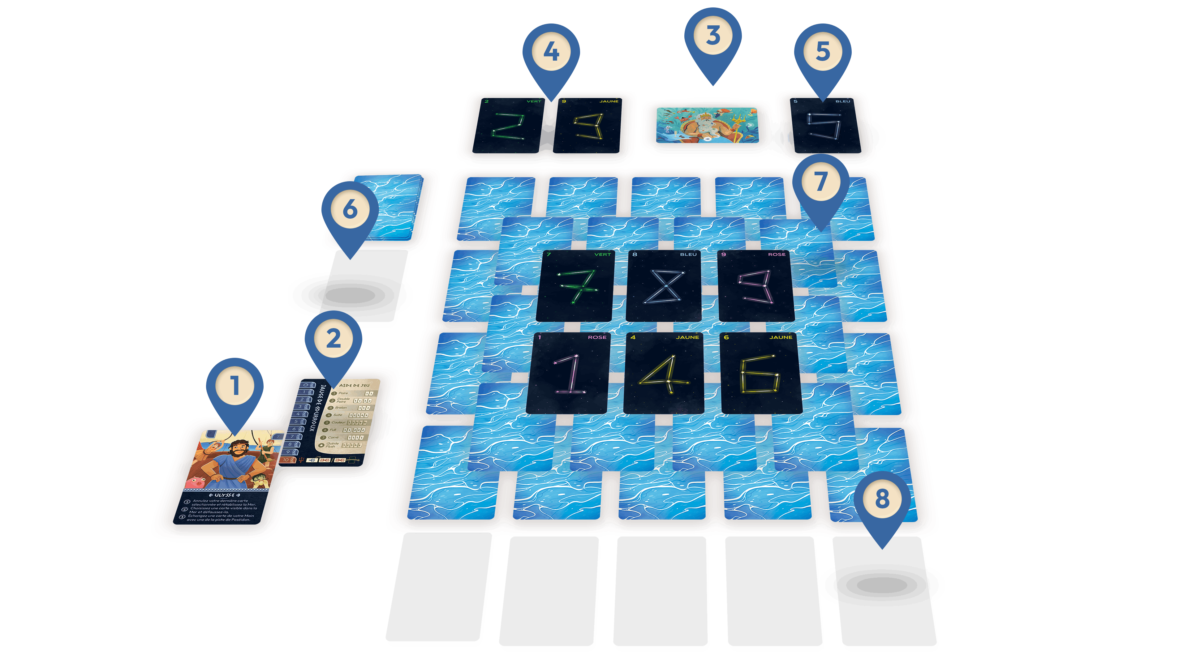 • Préparez la Mer : piochez au hasard 1 carte Épreuve parmi les 10 et ajoutez-la aux cartes Constellation. Laissez de la place pour la défausse des cartes Épreuve (6). Formez ensuite un rectangle de 20 cartes face cachée. Puis, placez une carte face cachée sur chaque intersection, et enfin une carte face visible sur chaque intersection (7).