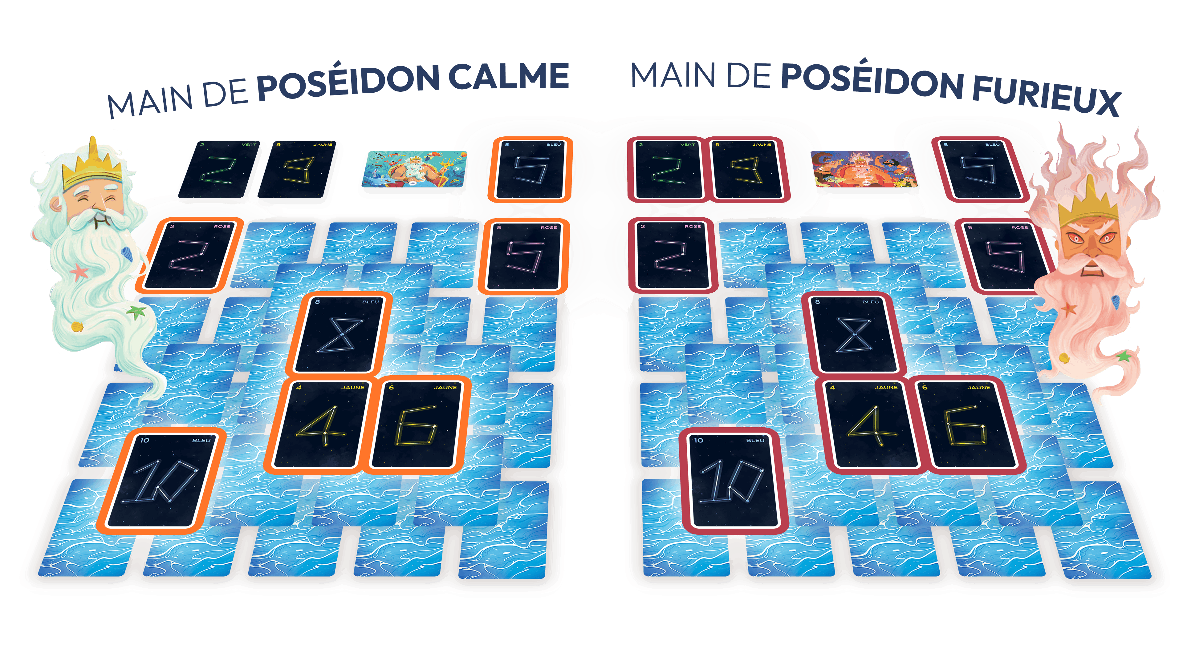 Si Poséidon est Calme, sa main est composée de toutes les cartes face visible dans la Mer, ainsi que des cartes situées à sa droite sur sa piste. S’il est Furieux, il inclut également les cartes situées à sa gauche.