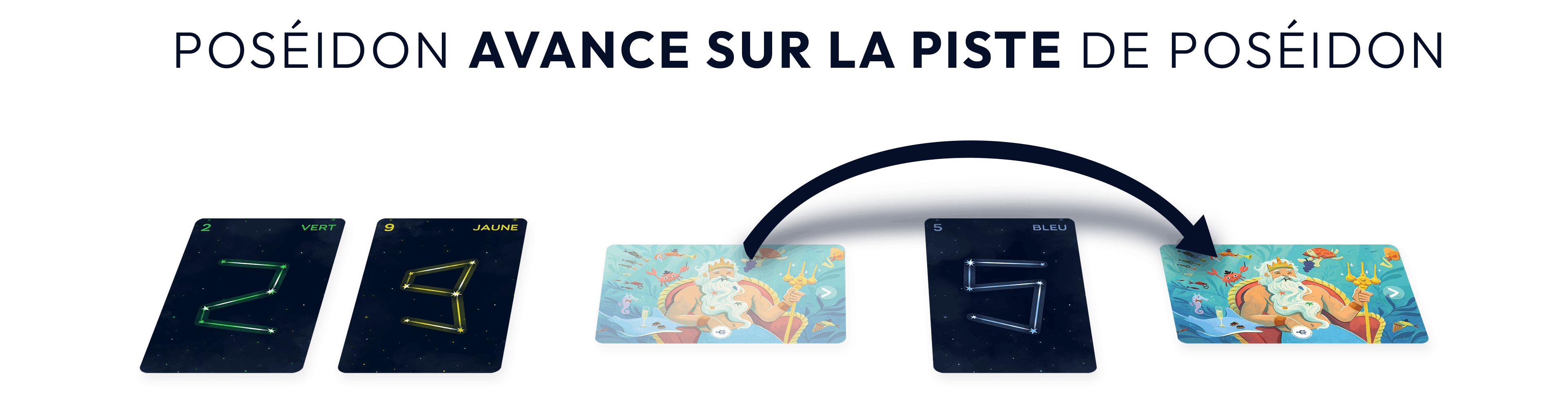 - Si Poséidon l’emporte, il avance d’une carte vers la droite sur sa piste et la Jauge de Courroux diminue de la différence de valeur entre vos deux mains.