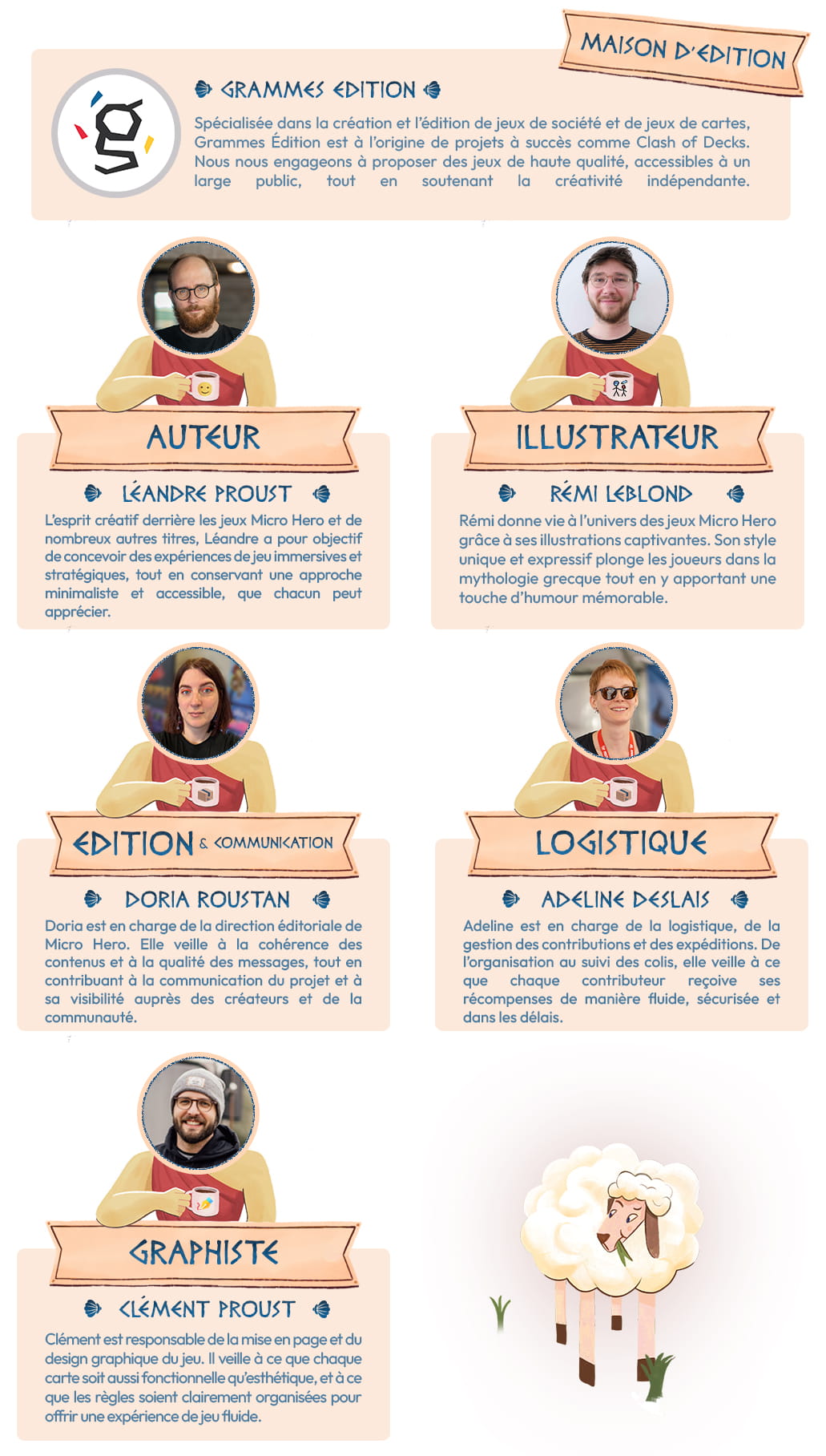 Soutenir cette campagne MICRO HERO, c’est rejoindre un projet ambitieux et accessible, porté par une équipe expérimentée. Avec plusieurs campagnes Kickstarter réussies à notre actif dont MICRO HERO Hercules et trois saisons de Clash of Decks nous avons déjà démontré notre capacité à livrer des projets de haute qualité, dans les délais. Chaque étape du processus créatif game design, illustrations, design graphique, édition et relecture est assurée par une petite équipe interne et un réseau de collaborateurs freelances, tous passionnés par leur métier.