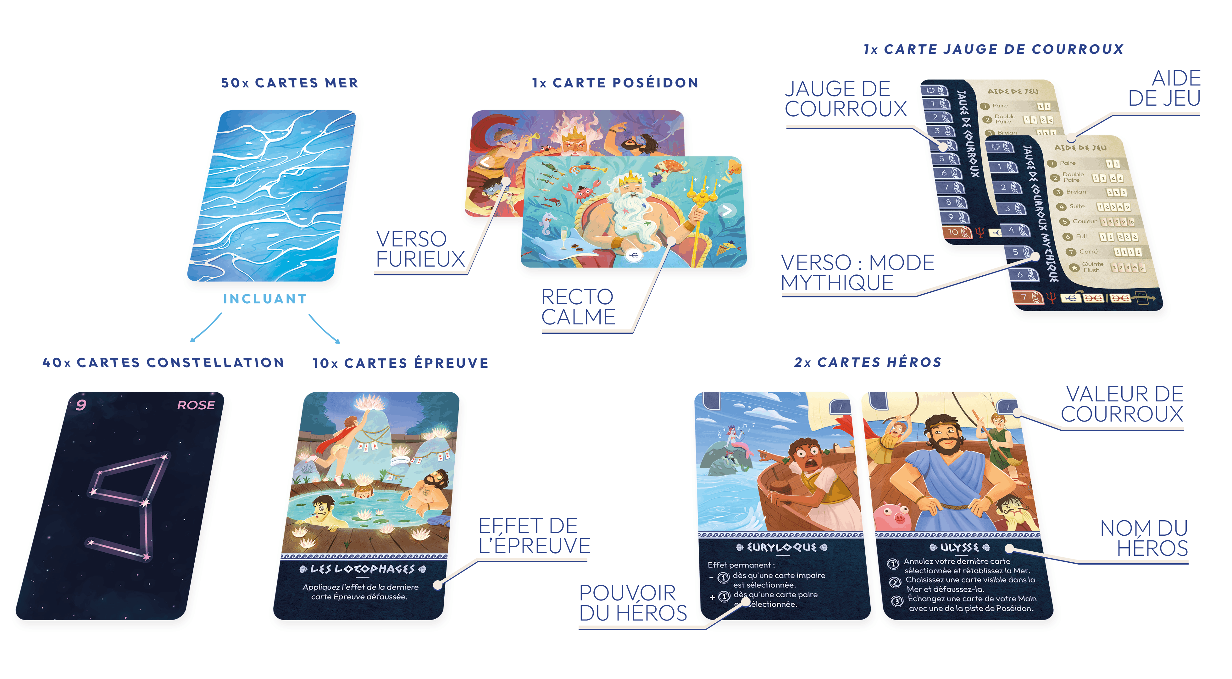 Un jeu de cartes solo mêlant draft et poker, dans lequel vous formez des combinaisons de constellations afin de guider Ulysse jusqu’à Ithaque, à travers une mer déchaînée par la fureur de Poséidon.