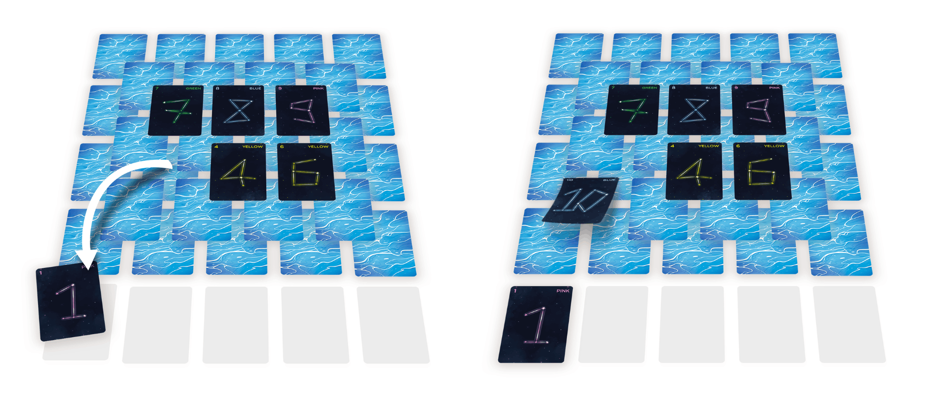 1. Phase de sélection : piochez, une par une, 5 cartes Constellation depuis la Mer afin de constituer votre Main.