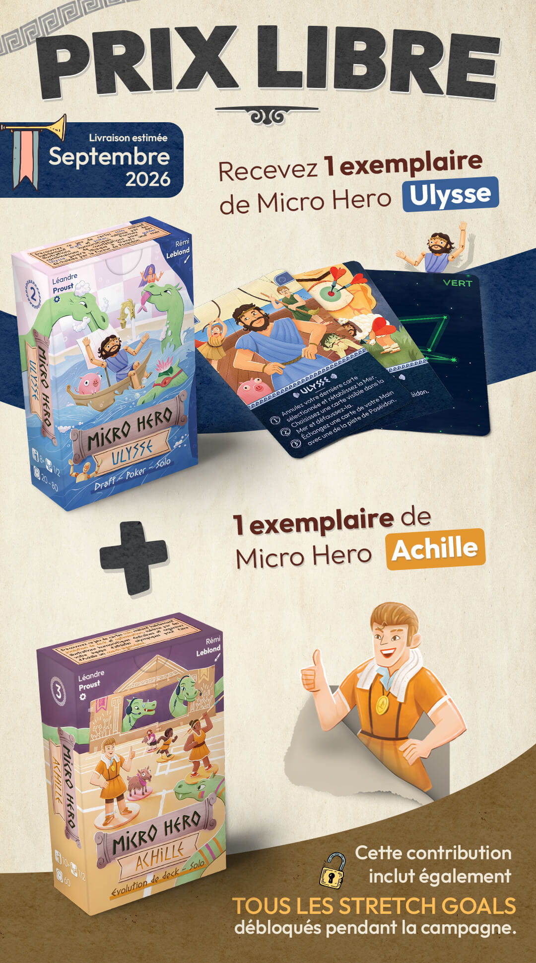 Avec cette récompense, vous recevrez un Lot incluant 1 exemplaire physique de MICRO HERO Ulysse + 1 exemplaire physique de MICRO HERO Achille.